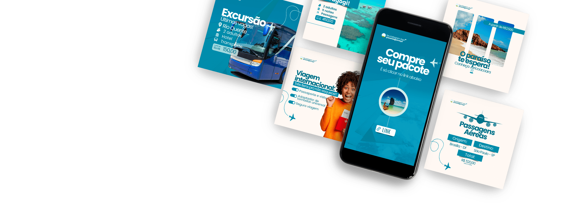 Modelos de Artes Estratégicas para você que trabalha com Agência de Viagens. Agora você não tem mais desculpa para não produzir conteúdo, todas as artes já estão com o conteúdo pronto para você se inspirar.