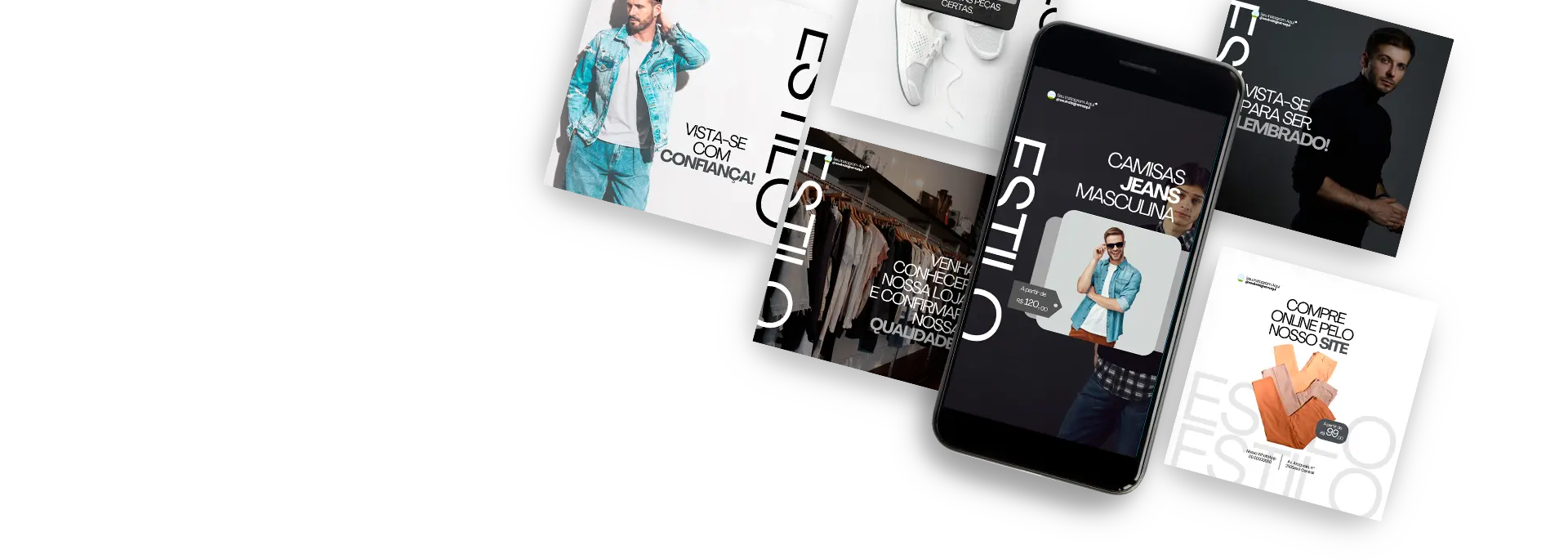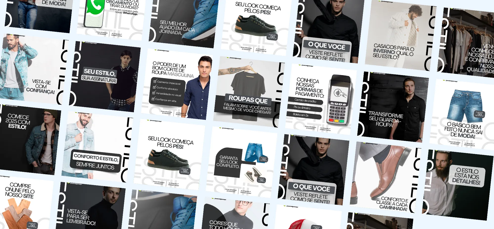 Modelos de Artes Estratégicas para você que trabalha com LOJA MASCULINA. Agora você não tem mais desculpa para não produzir conteúdo, todas as artes já estão com o conteúdo pronto para você se inspirar.