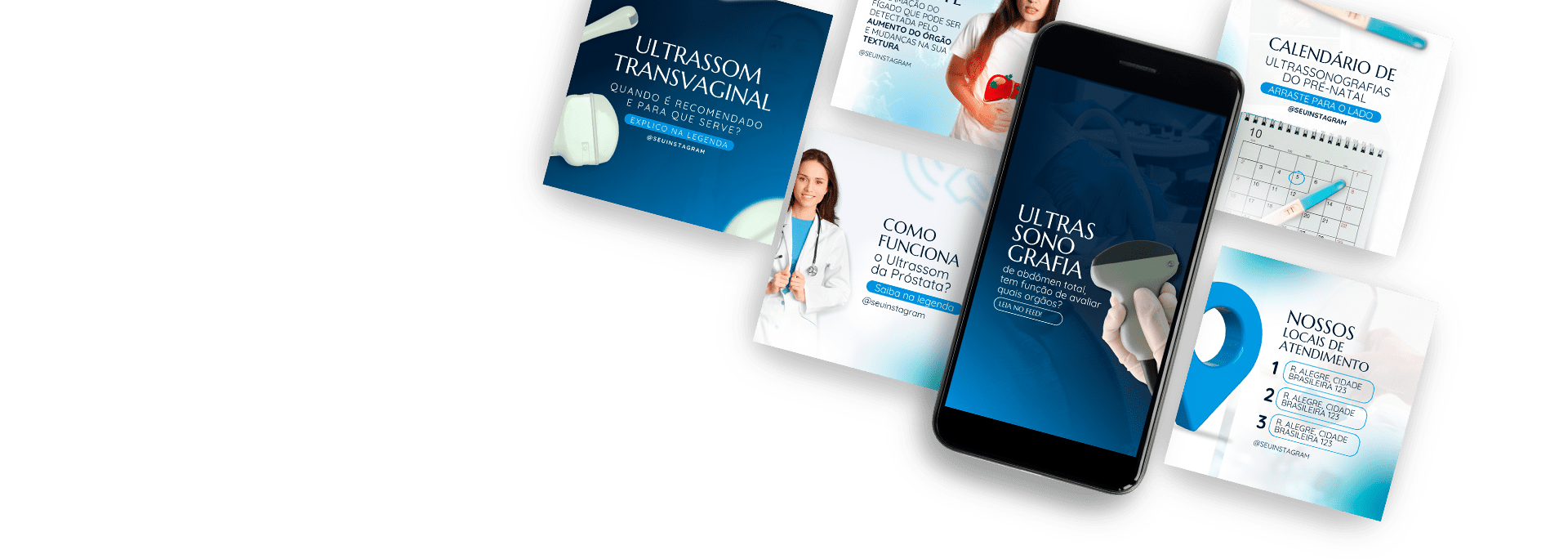 Modelos de Artes Estratégicas para você que trabalha com Ultrassonografia. Agora você não tem mais desculpa para não produzir conteúdo, todas as artes já estão com o conteúdo pronto para você se inspirar.